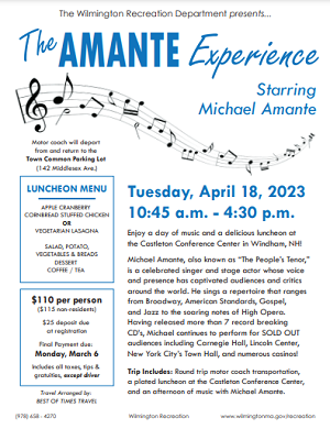 by Robert Hayes Posted on November 25, 2022November 25, 2022 Wilmington Recreation Department To Offer Day Trip To Windham, New Hampshire For Michael Amante Concert & Luncheon On April 18 Read More