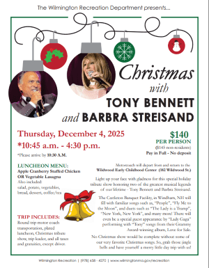 by Robert Hayes Posted on August 22, 2025August 23, 2025 Wilmington Recreation Department To Offer Day Trip To Christmas With Tony Bennett & Barbara Streisand On December 4 Read More