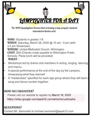 by Robert Hayes Posted on February 27, 2020March 15, 2020 WHS Lamplighters Drama Club To Hold Day Camp For Grades 1-8 Students On March 28 Read More